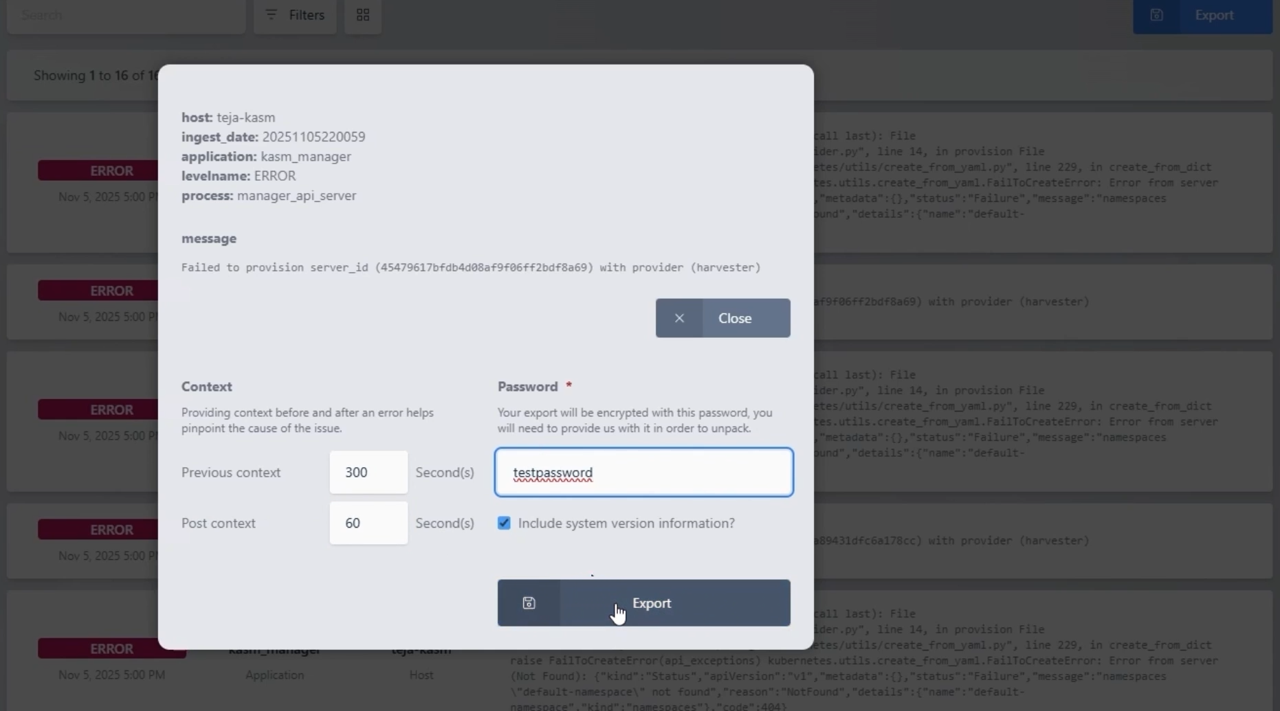 For targeted troubleshooting, you can export logs surrounding a specific event or error.