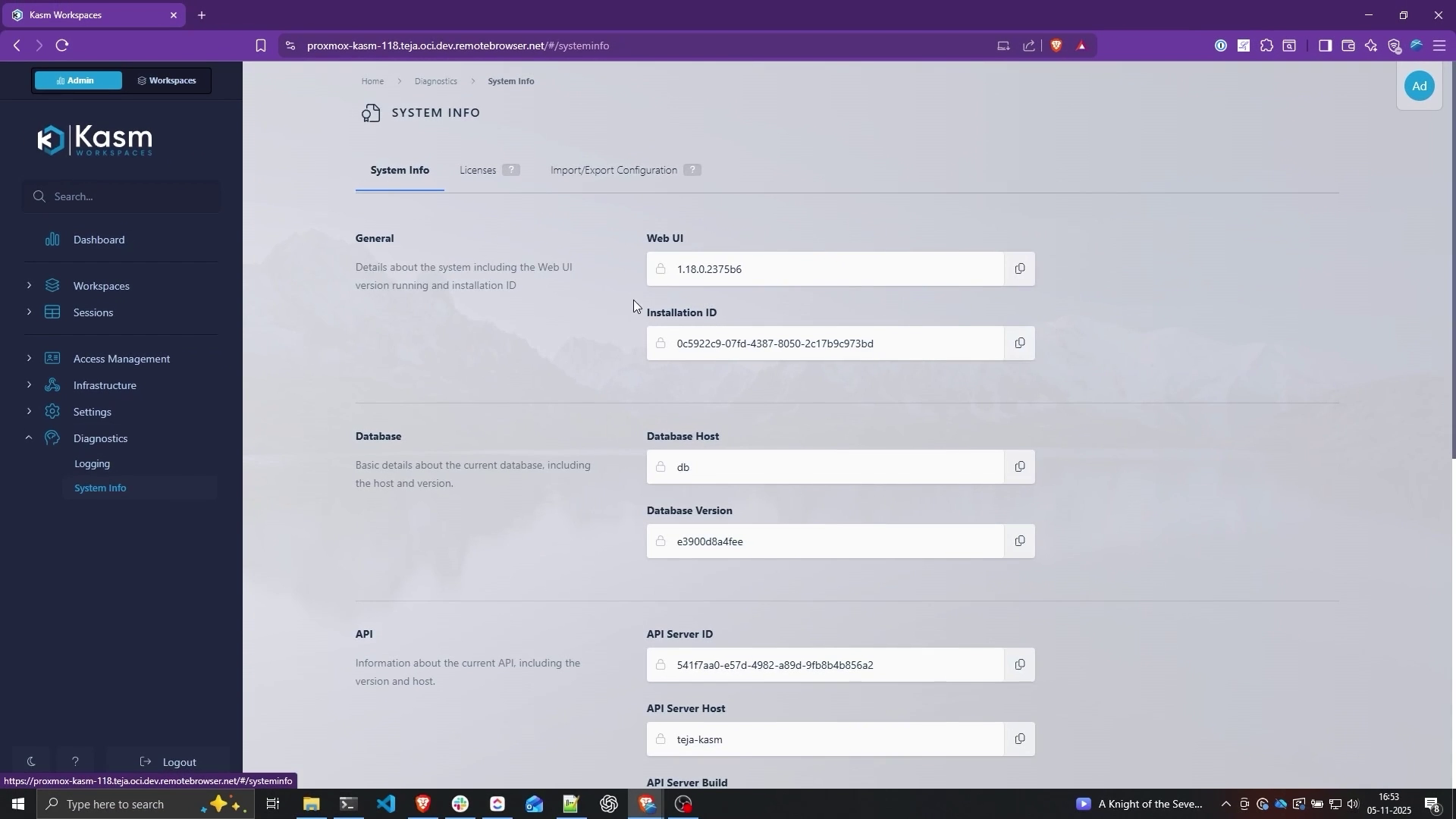 On your Kasm Admin panel, go to “Diagnostics” → “System Info”. Extract the following information from this page: