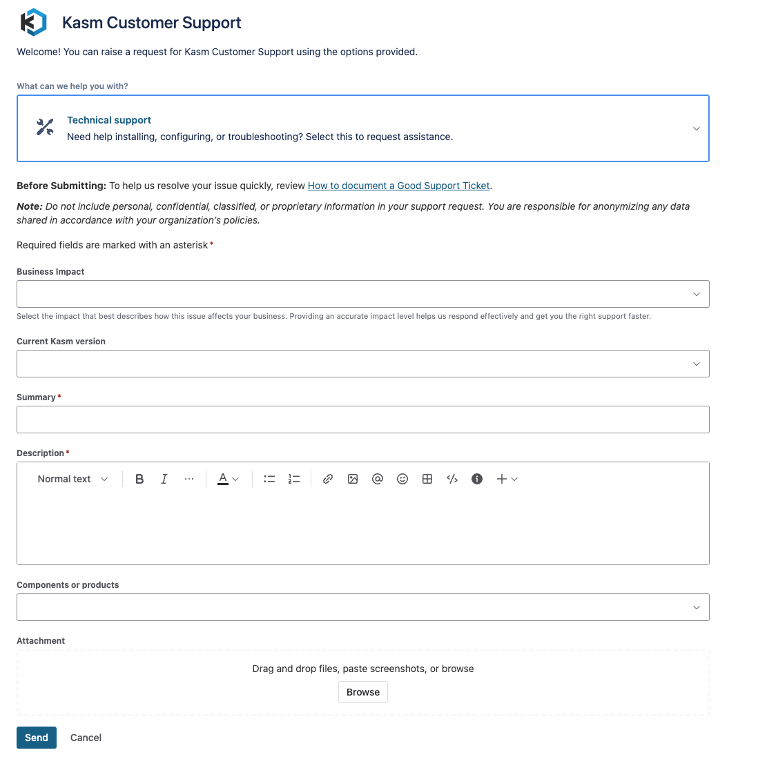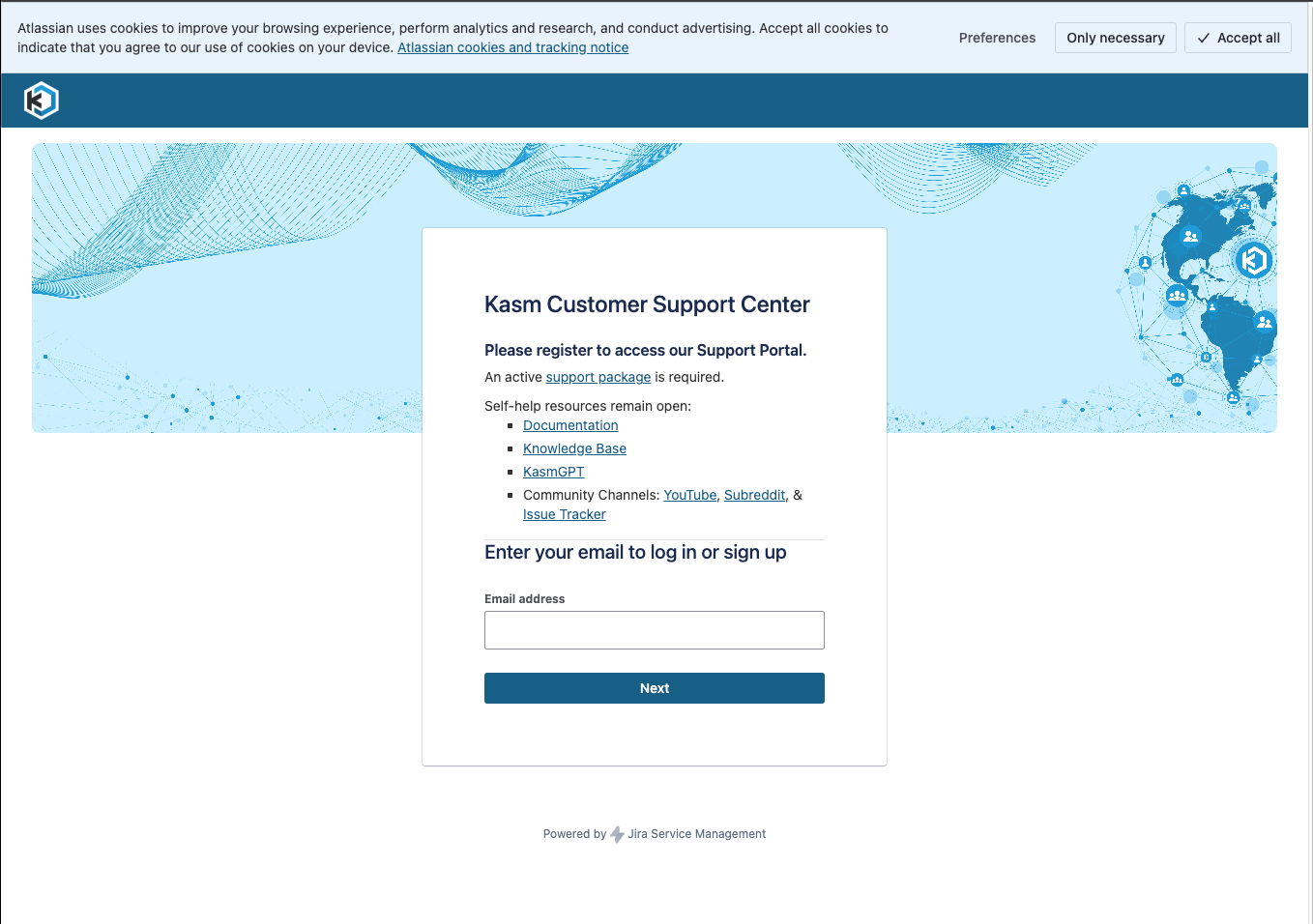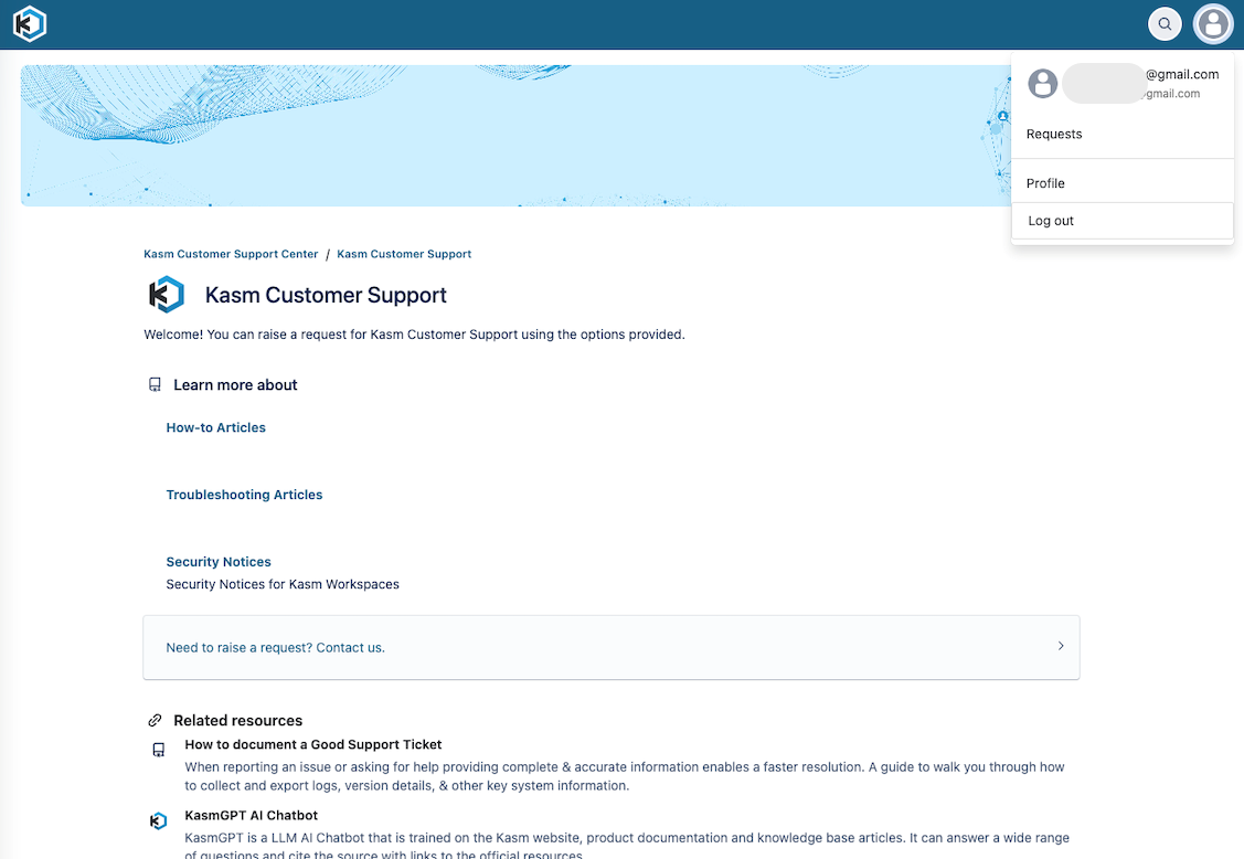 The Kasm Customer Support Portal (support.kasm.com) is where customers can submit support requests and access self-help resources.