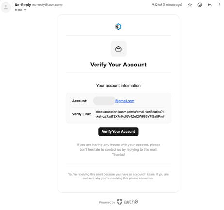 A verification email will arrive from no-reply@kasm.com. Click Verify Your Account in the email, then click Continue on the confirmation screen.
