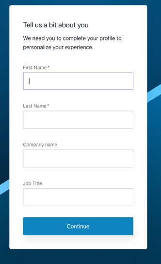 Enter your First Name, Last Name, Company Name, and Job Title. Click Continue.